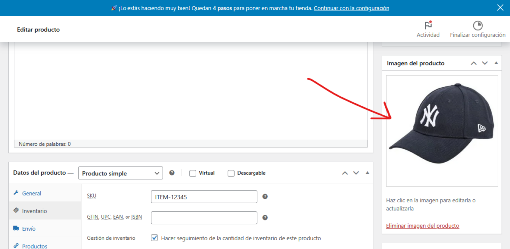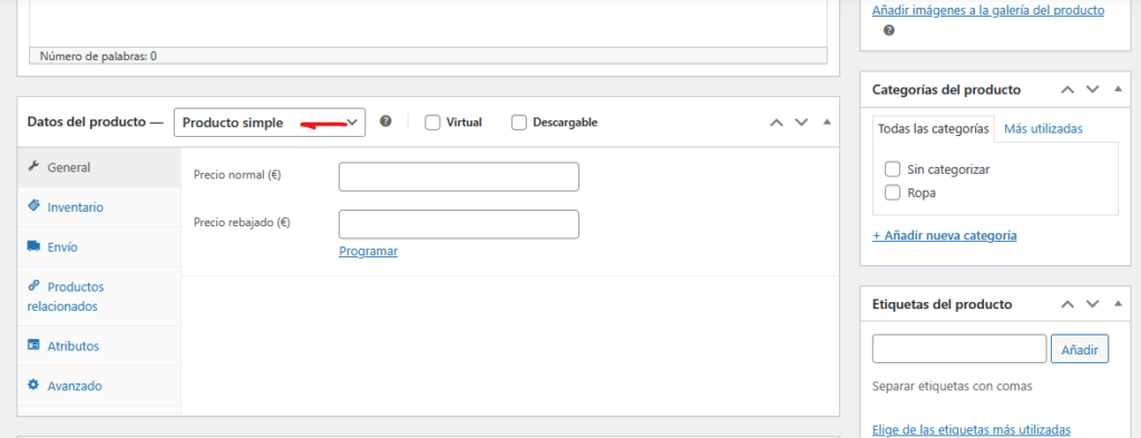 1. En la sección Datos del producto, asegúrate de que Producto simple está seleccionado.