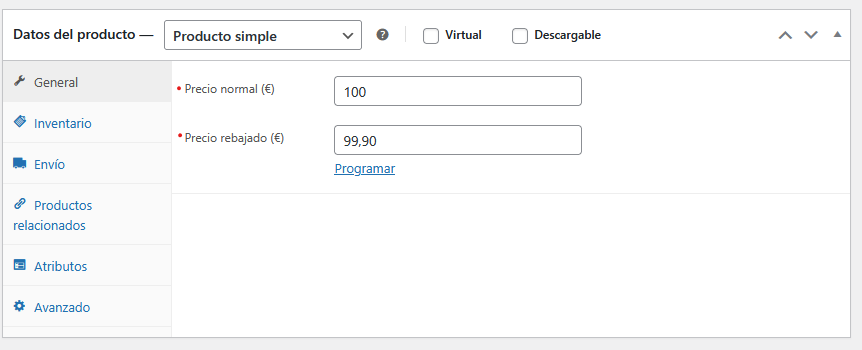 • Precio rebajado (opcional, puedes programar fechas de oferta).