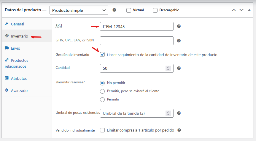 • Activar la opción Gestionar inventario y definir el Stock disponible.