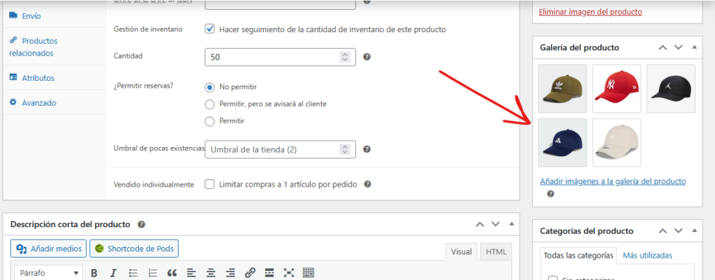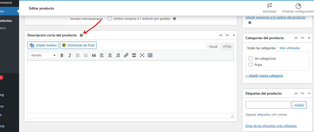 En el cuadro Descripción corta del producto (debajo de «Datos del producto»), escribe un resumen breve y atractivo. Esta descripción se mostrará junto al precio en la página del producto.